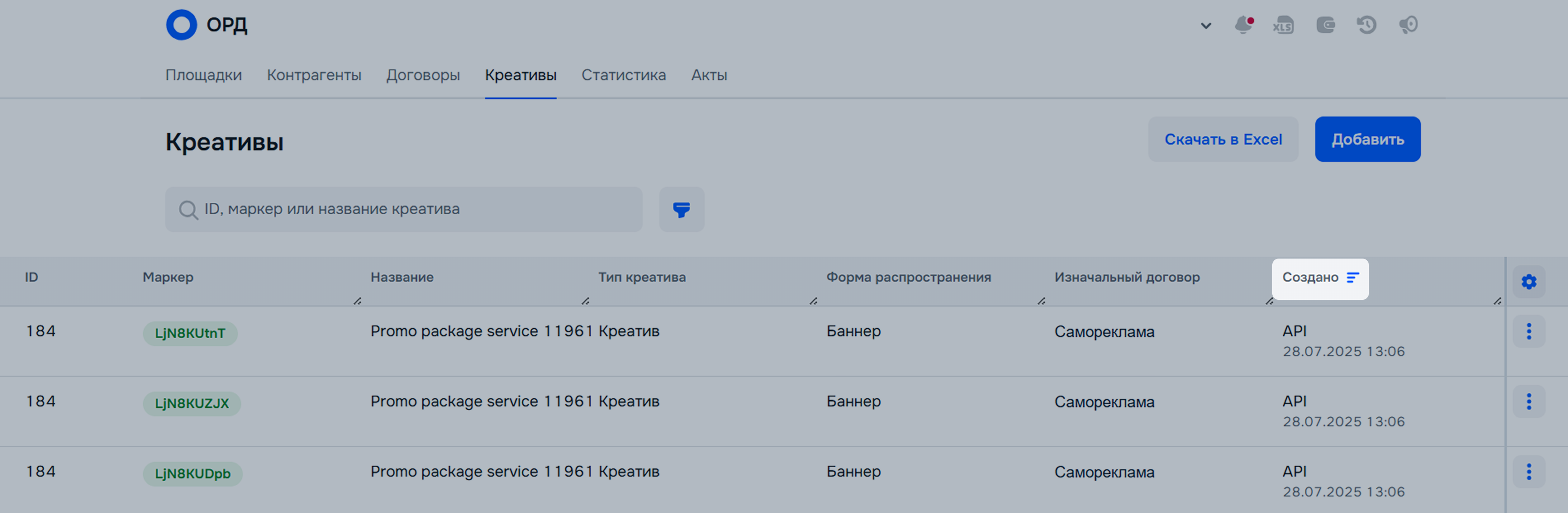 Каждому креативу Ozon присвоит ID рекламы и маркер, которые появятся в разделе Креативы.