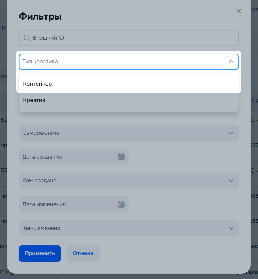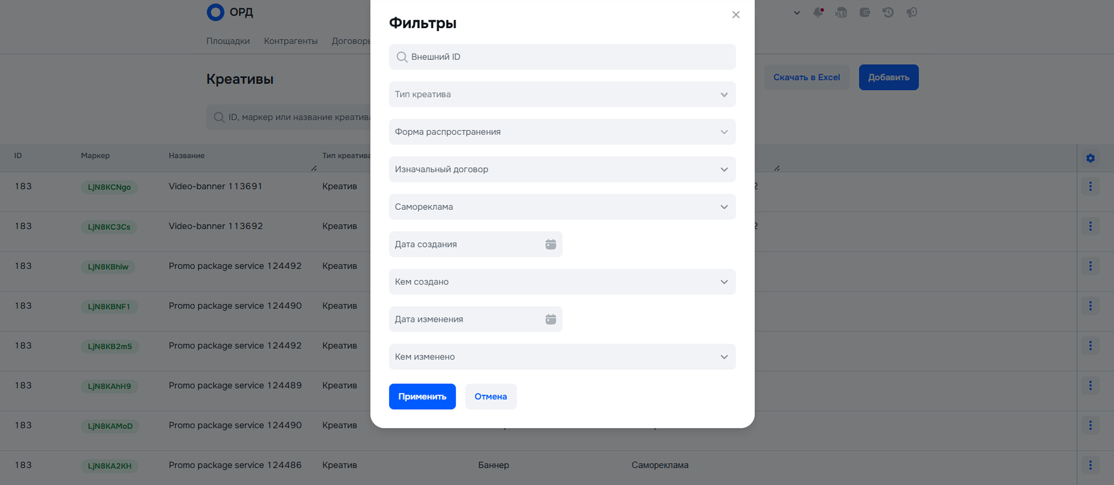 - Совместная кампания — если креатив относится к совместной кампании и зарегистрирован на несколько изначальных договоров.