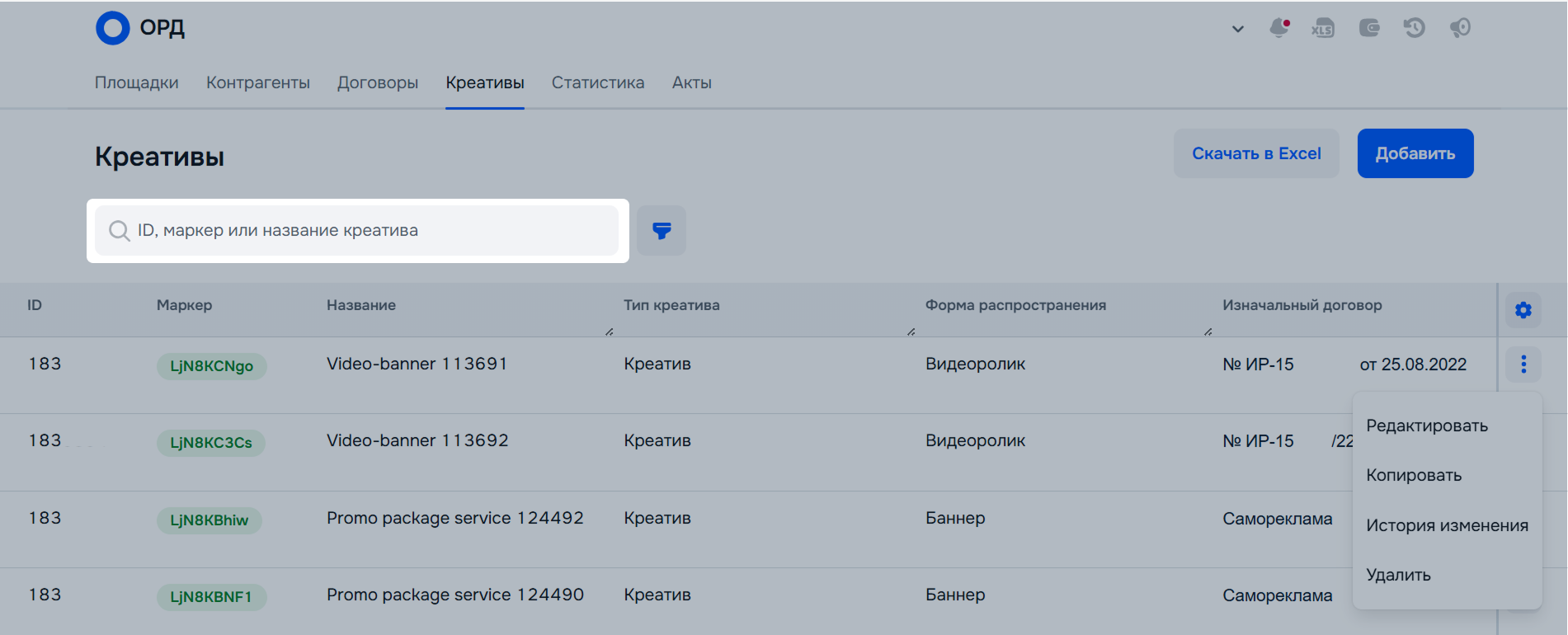 Чтобы найти креатив, введите в поиске ID, маркер или название креатива.