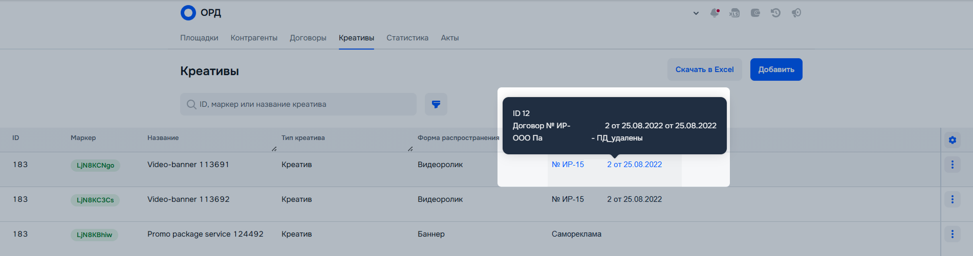 Чтобы посмотреть информацию об исполнителе, заказчике и дате договора, наведите курсор на гиперссылку. Чтобы посмотреть все договоры креатива, зарегистрированного на несколько изначальных договоров, нажмите на гиперссылку.