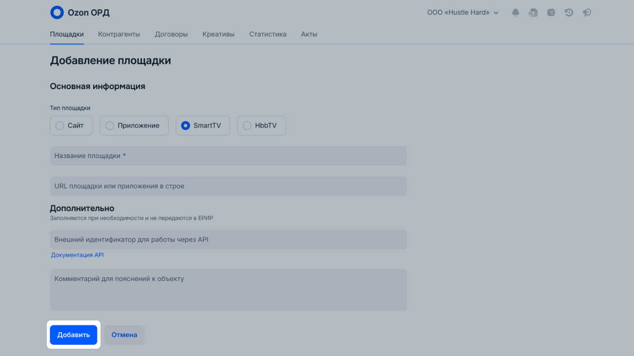 После прохождения регистрации вы получите доступ к личному кабинету Ozon ОРД. После этого вам необходимо добавить площадки.