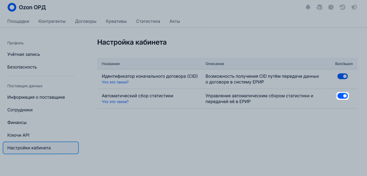 В разделе Профиль → Настройки кабинета включите Идентификатор изначального договора (CID).