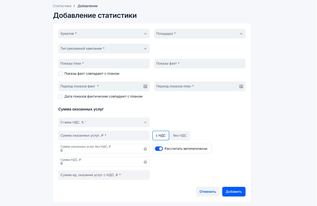 Даты начала и окончания периода, в котором нужно автоматически собирать показы креатива, формировать статистику и передавать её в ЕРИР. Указывайте дату по московскому времени. Если данные по показам будут только за часть месяца, в статистике этот период отобразится в поле Даты показов факт. Если вы не укажете дату окончания, статистика будет собираться ежемесячно.