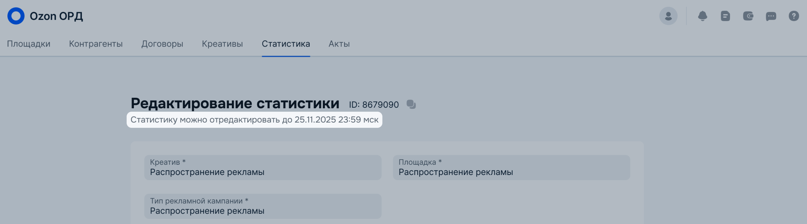 Если к статистике привязаны акты, она доступна для редактирования до 25-го числа 23:59 второго месяца, следующего за отчётным периодом — календарным кварталом. После этого редактирование станет недоступно на стороне ЕРИР.