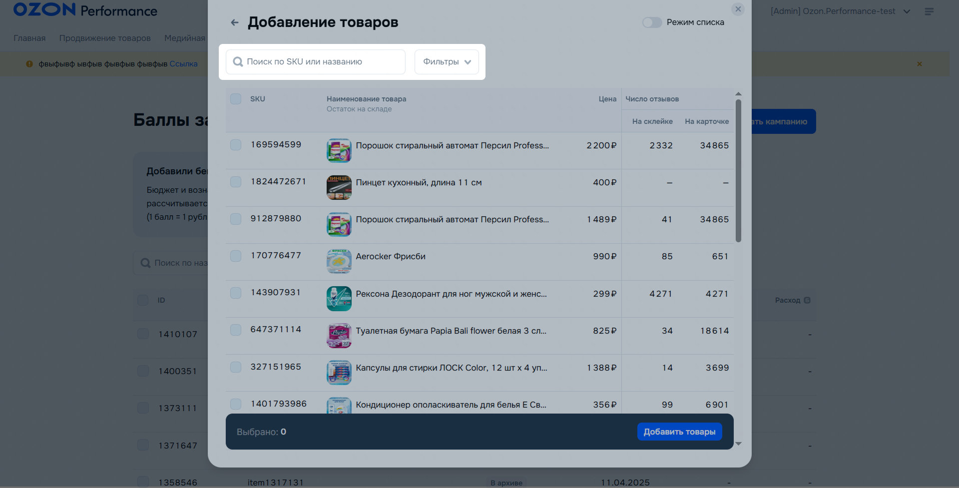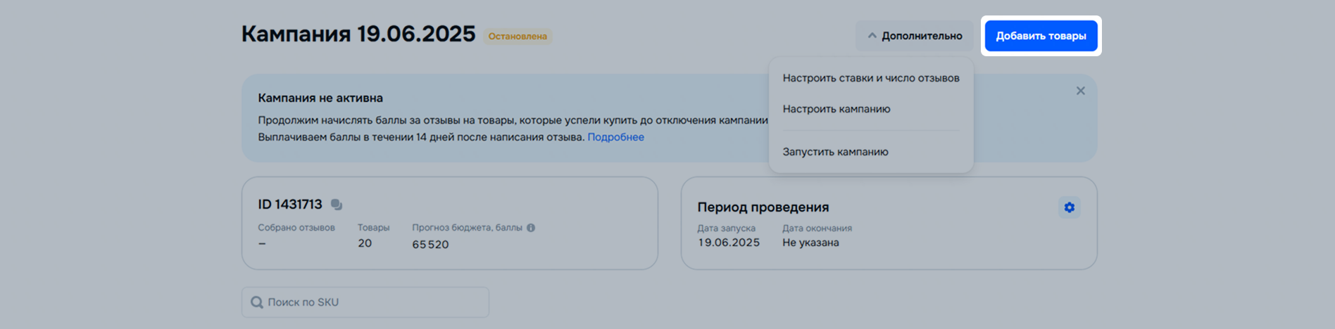 Чтобы добавить товары в кампанию, нажмите Добавить товары.