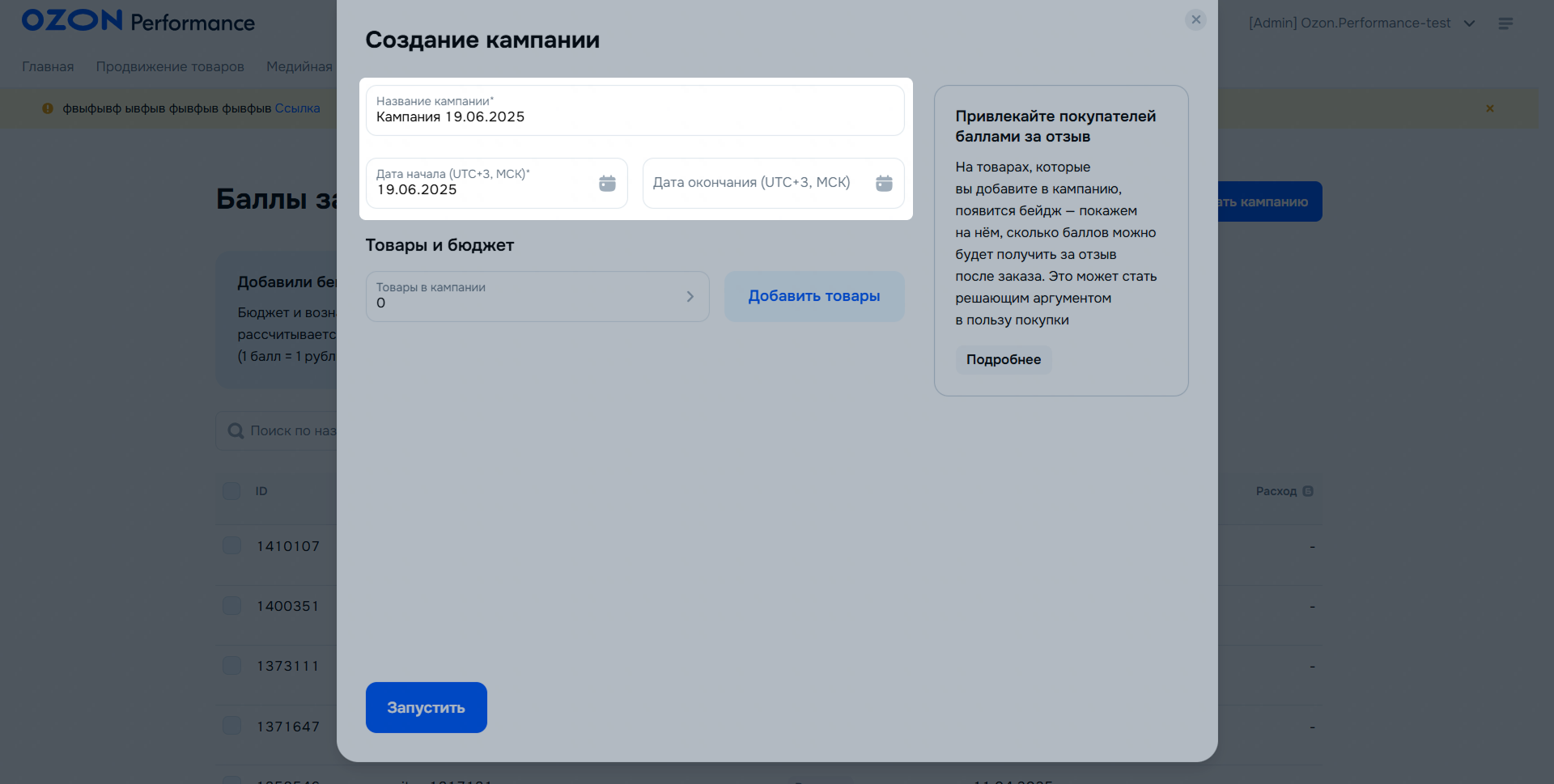 - Дата окончания кампании — при желании. Если укажете, кампания завершится в эту дату или когда соберётся нужное количество отзывов. Если не укажете, кампания будет работать до сбора всех отзывов.