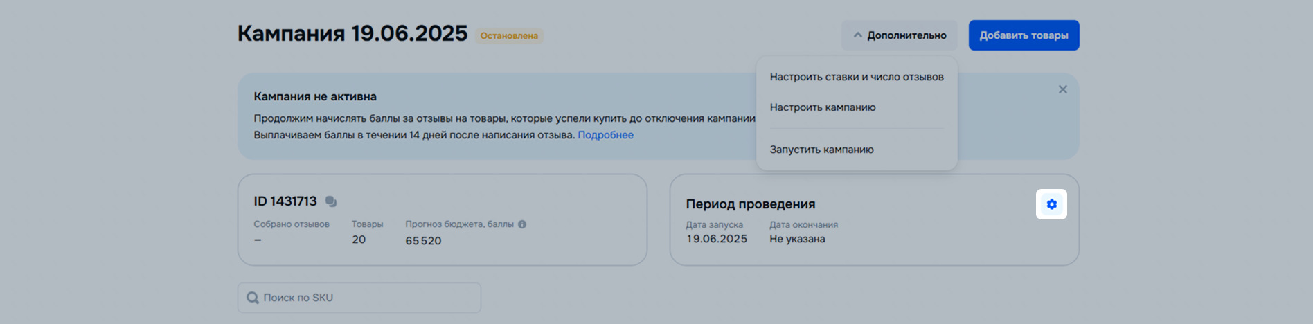 Если вы останавливаете кампанию, покупатель, получивший уведомление об акции, может оставить отзыв до конца дня. Плата за такой отзыв будет списана через 14 дней, когда отзыв пройдёт модерацию и будет опубликован.