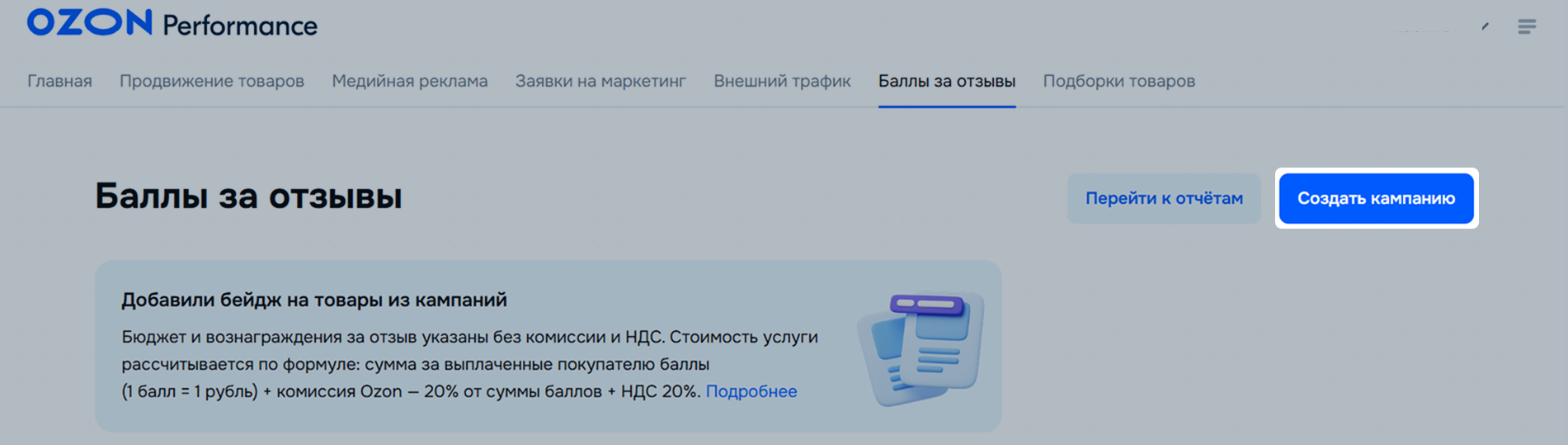 - Вы создаёте кампанию для товара. У товаров, которые участвуют в кампании, отображается бейдж в поисковой выдаче и в карточке. На нём покупатель видит, сколько баллов получит за отзыв.