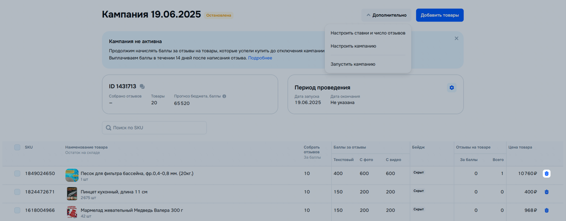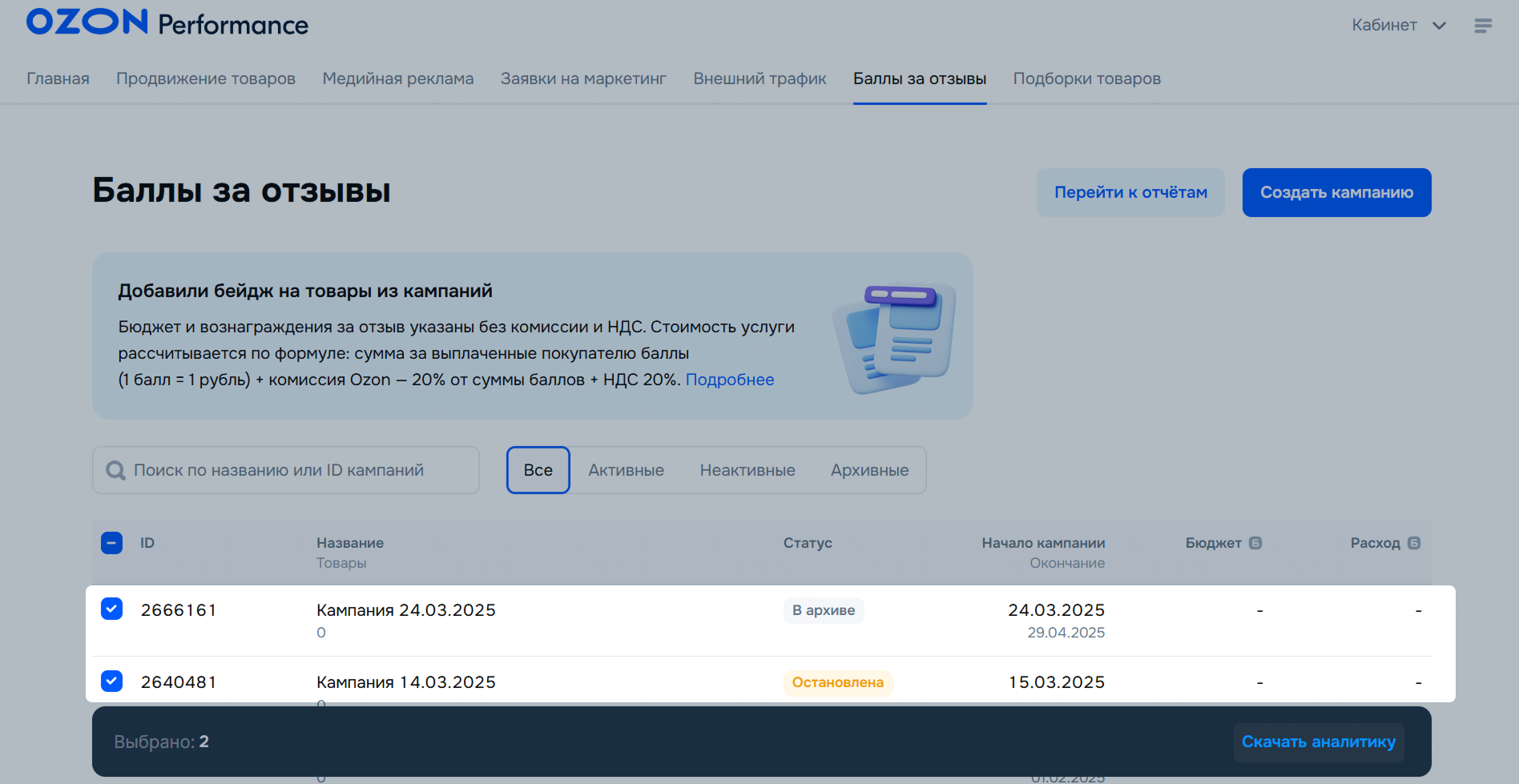 Перейдите в раздел Баллы за отзывы. В таблице отображается список всех кампаний по вкладкам: