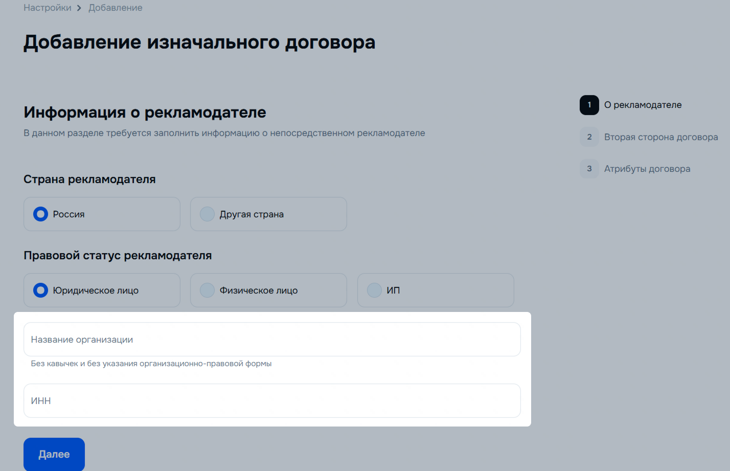 - Укажите ИНН — идентификационный номер рекламодателя.