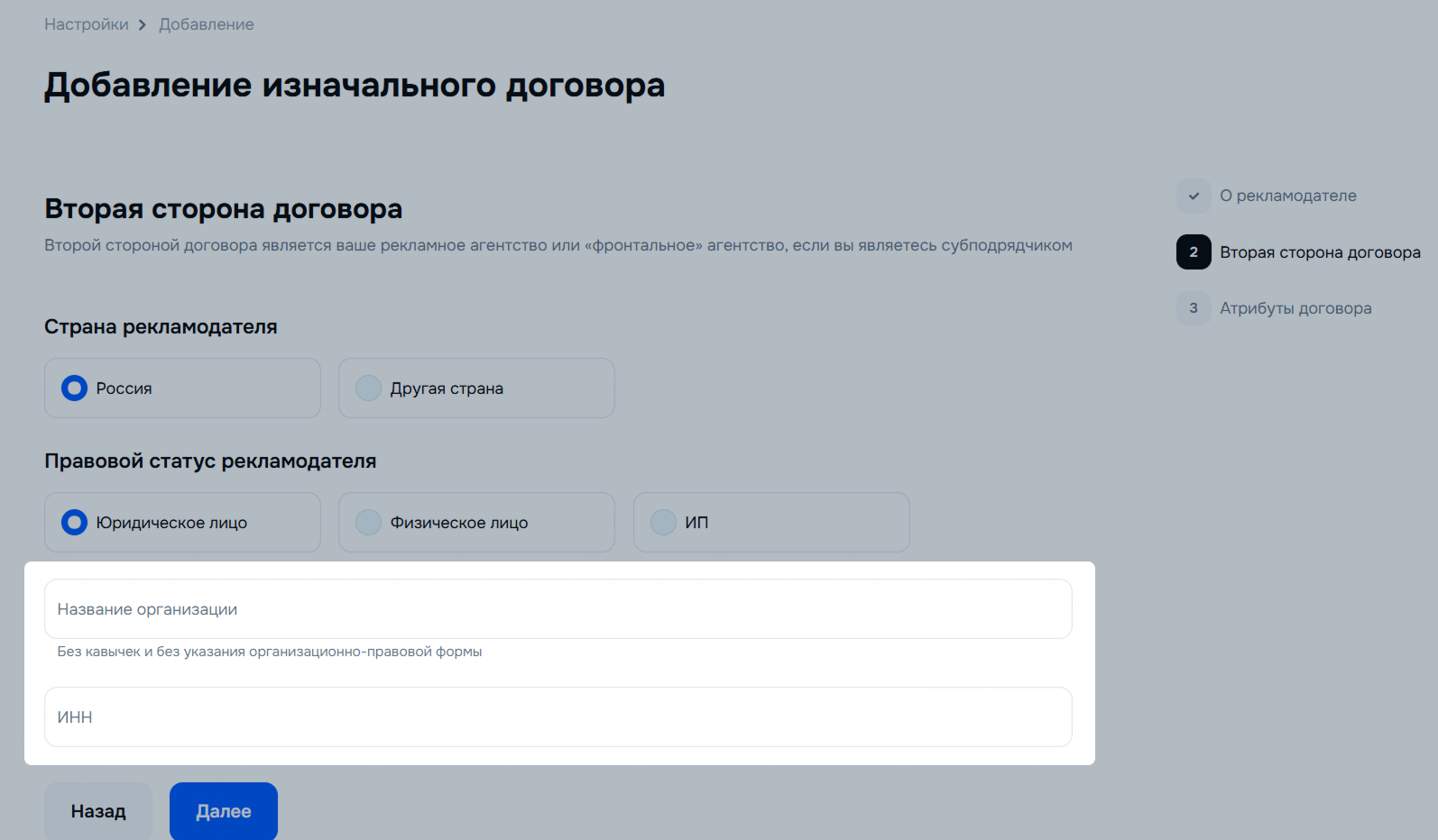- Заполните информацию о второй стороне договора, которой является ваше рекламное агентство или другой посредник, если вы являетесь субподрядчиком. Укажите страну второй стороны договора: Россия или другая страна.