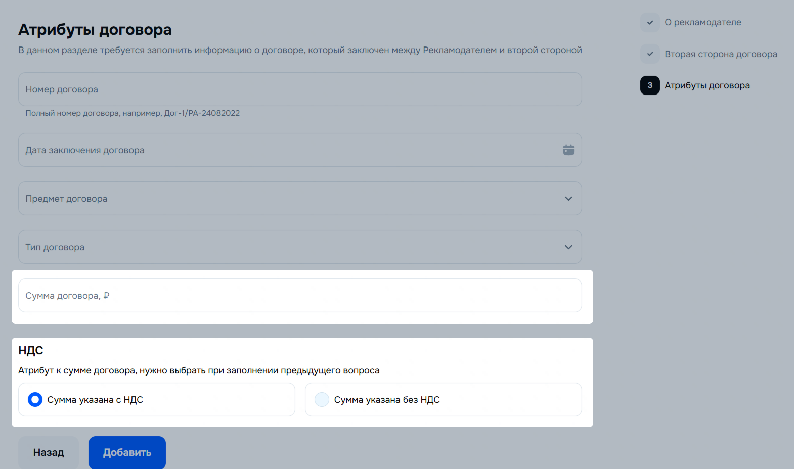 Укажите сумму договора и отметьте, включён ли в неё НДС.