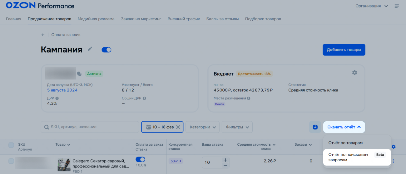 - Перейдите в раздел Продвижение товаров → Оплата за клик и откройте нужную кампанию.