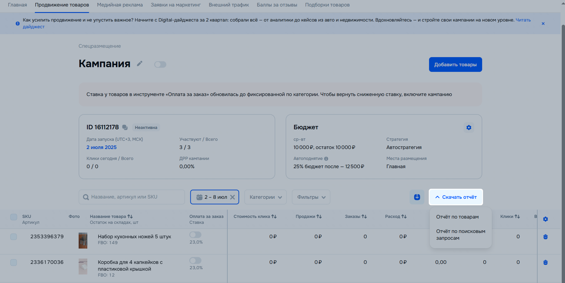 - Перейдите в раздел Продвижение товаров → Спецразмещение и откройте нужную кампанию.
