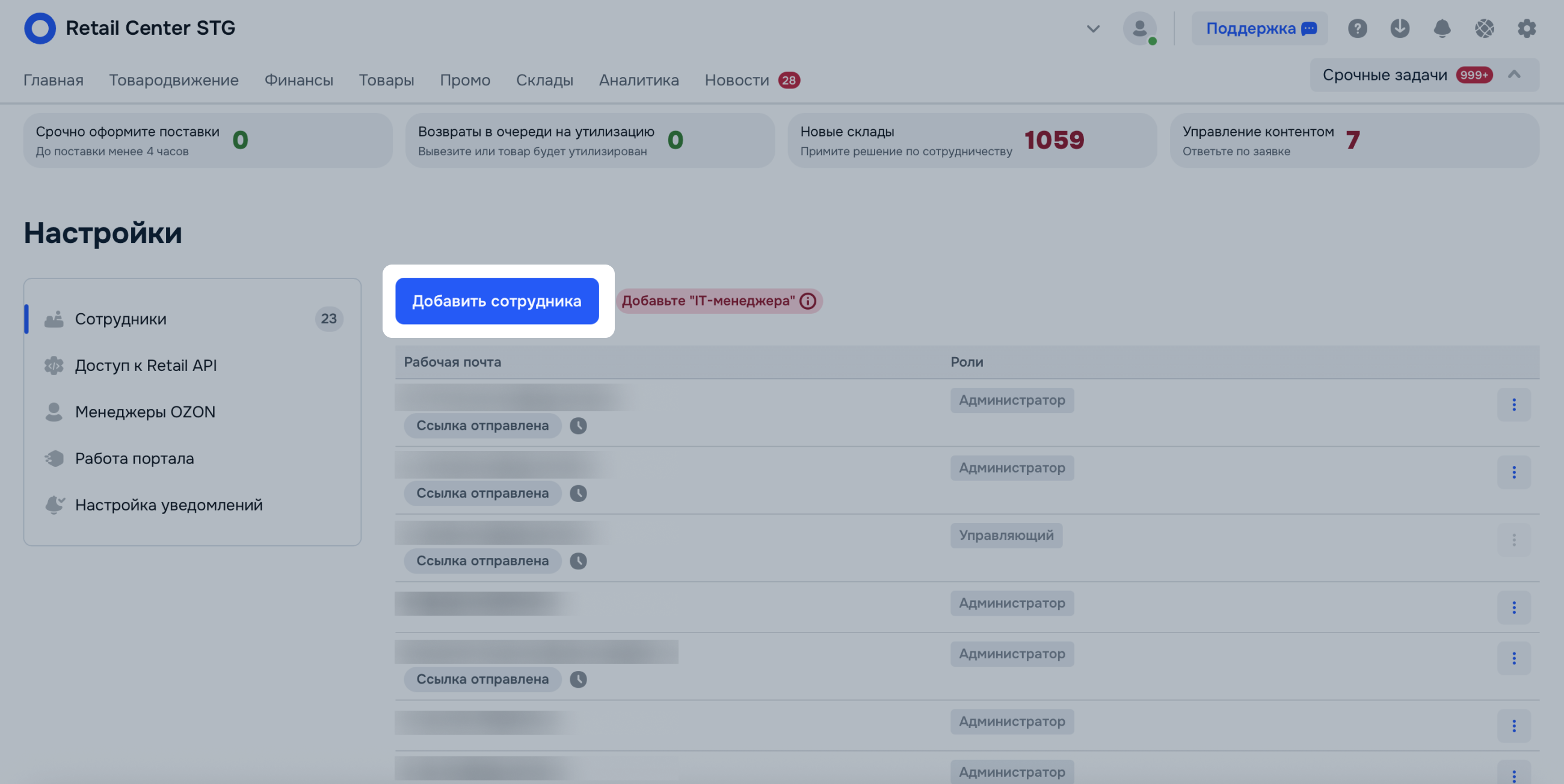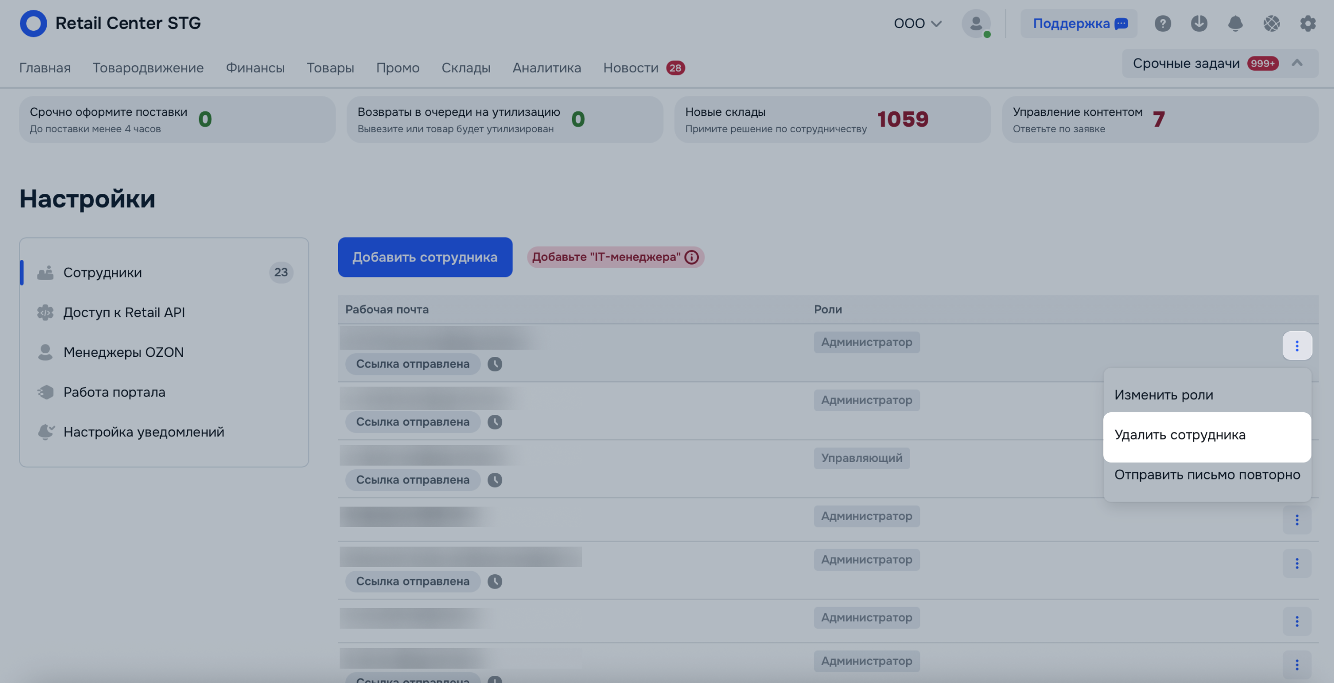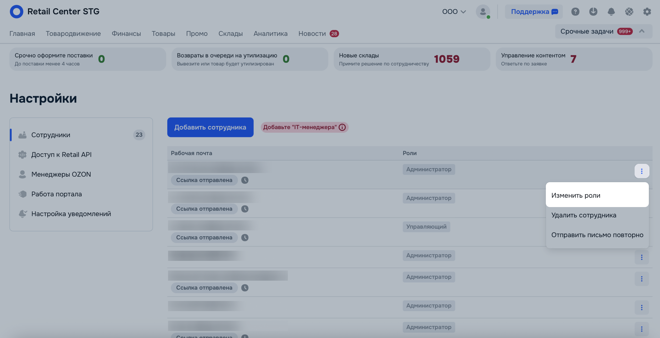 | Архивная роль | Пользователь перенесён из Ozon Seller c ролью, которой нет в Ozon Retail. Назначьте сотруднику другую роль. |